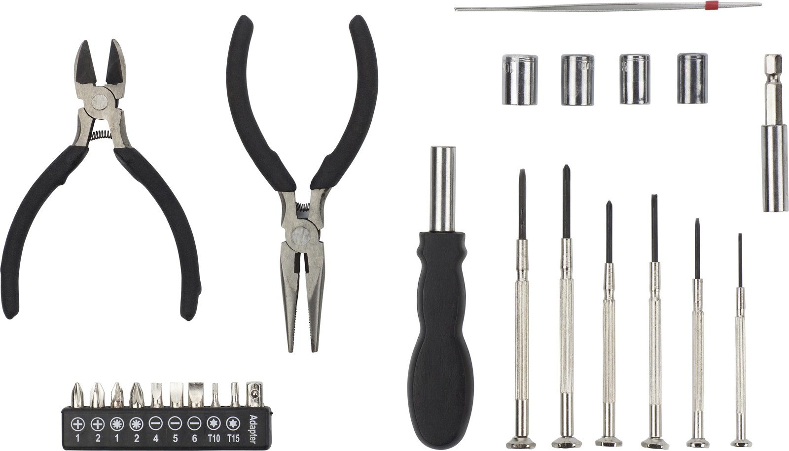 • Sisältö: kaksi pihtiä, pidike, jossa on yhdeksän erilaista bittiä, sovitin, pinsetit, neljä vetopistorasiaa, sovitin, kahva ja kuusi erilaista tarkkuustyökalua