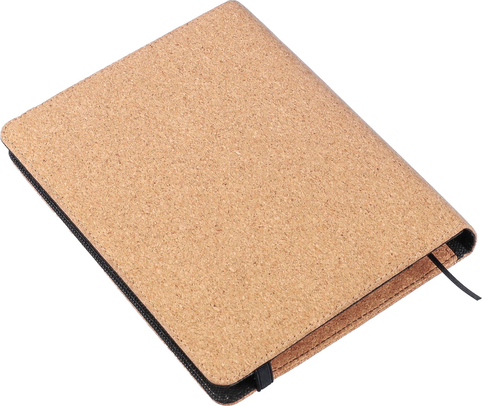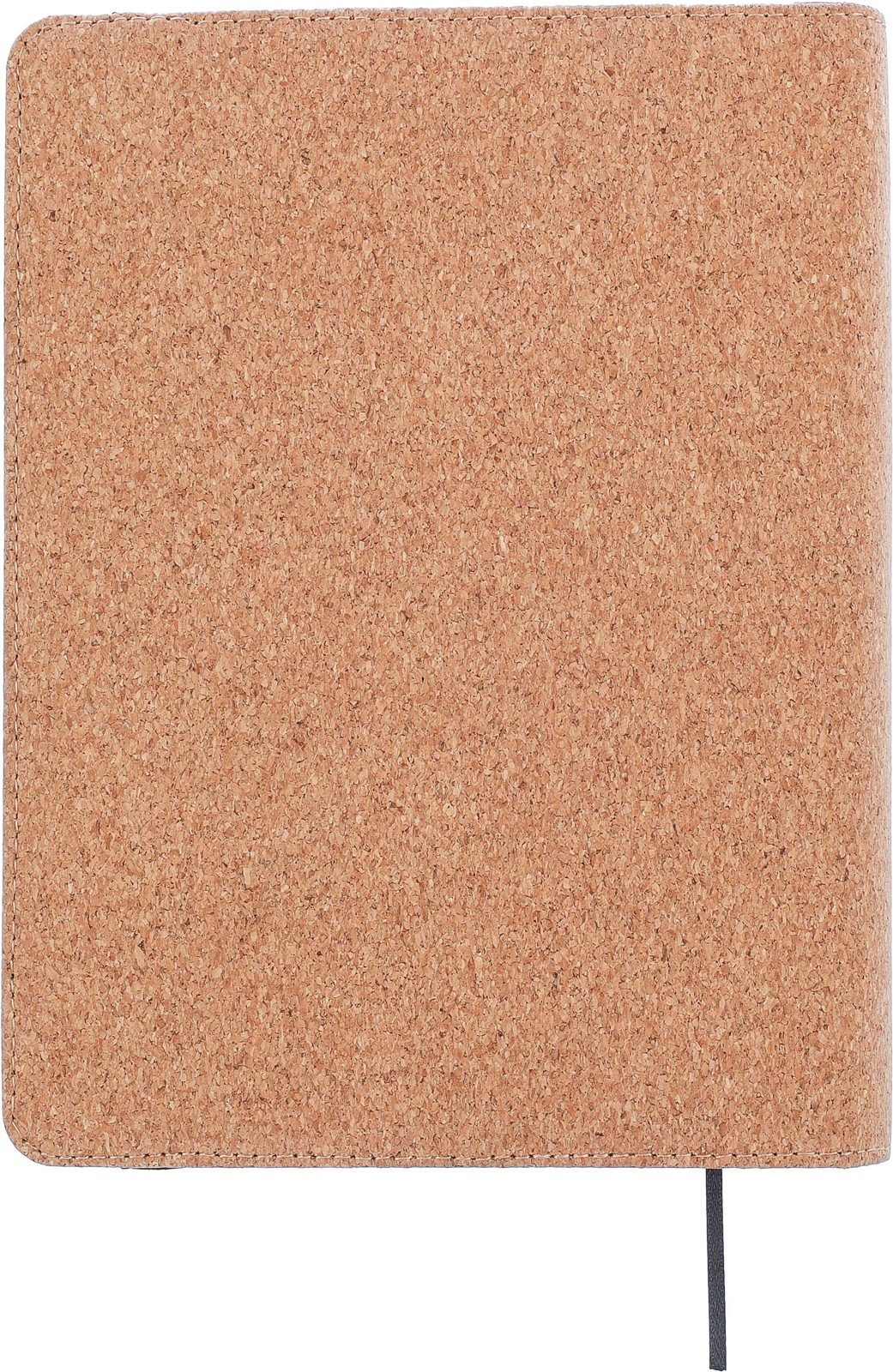 Noin A5-kokoinen asiakirjakansio, korkkia. Sisäpuolella taskuja, elastinen sulkurengas ja irrotettava A5 muistikirja, jossa 192 kappaletta viivoitettua kierrätettyä paperia.