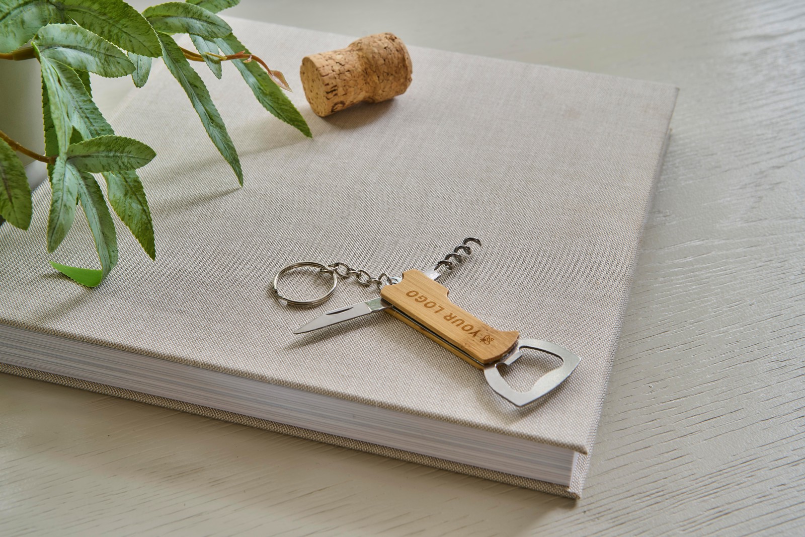 Bambu avaimenperä/monitoimityökalu, jossa kolme toiminnallisuutta (pullonavaaja, taskuveiti, korkinavaaja). Pakataan erikseen ruskeaan pahvilaatikkoon.