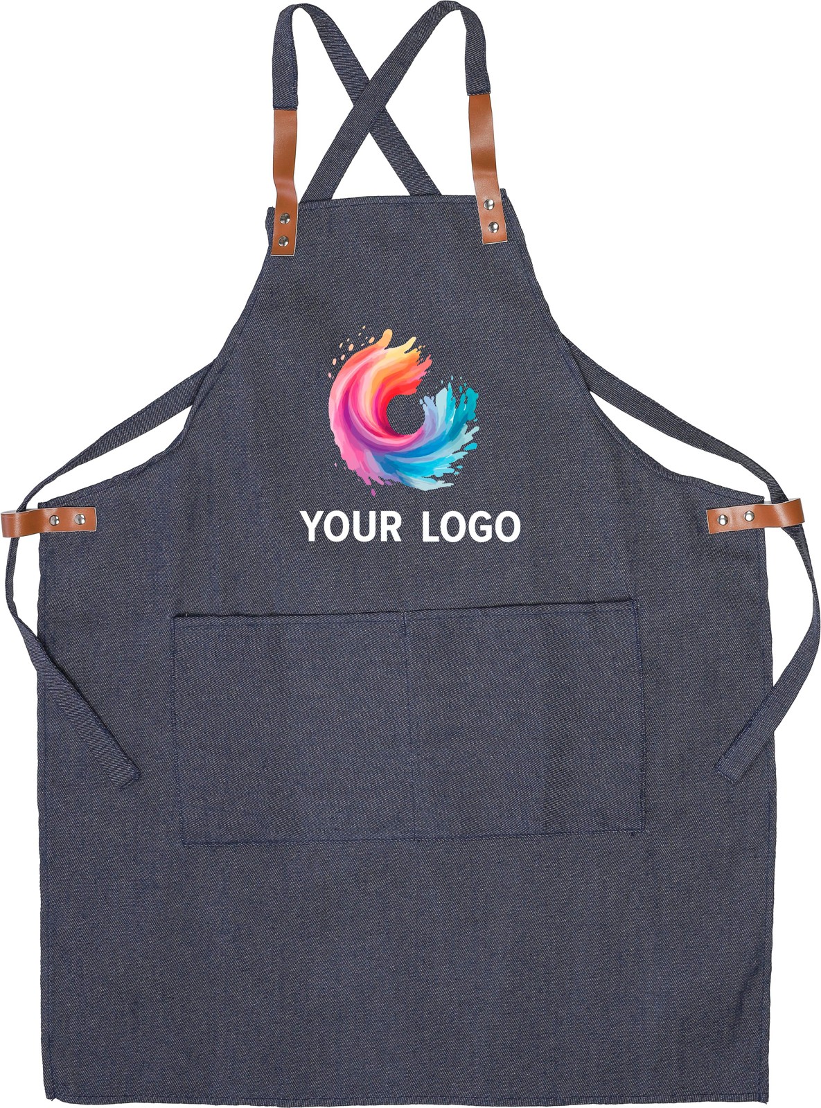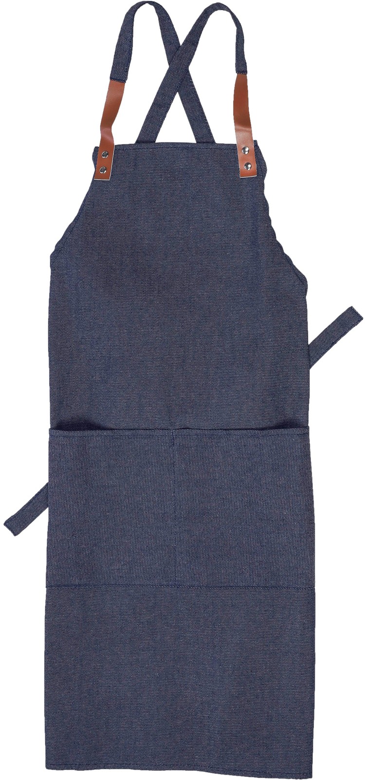 Denimistä valmistettu esiliina, jossa on olkahihnat ja kaksi etutaskua. Anna kotikokille lahjaksi tyyliä!