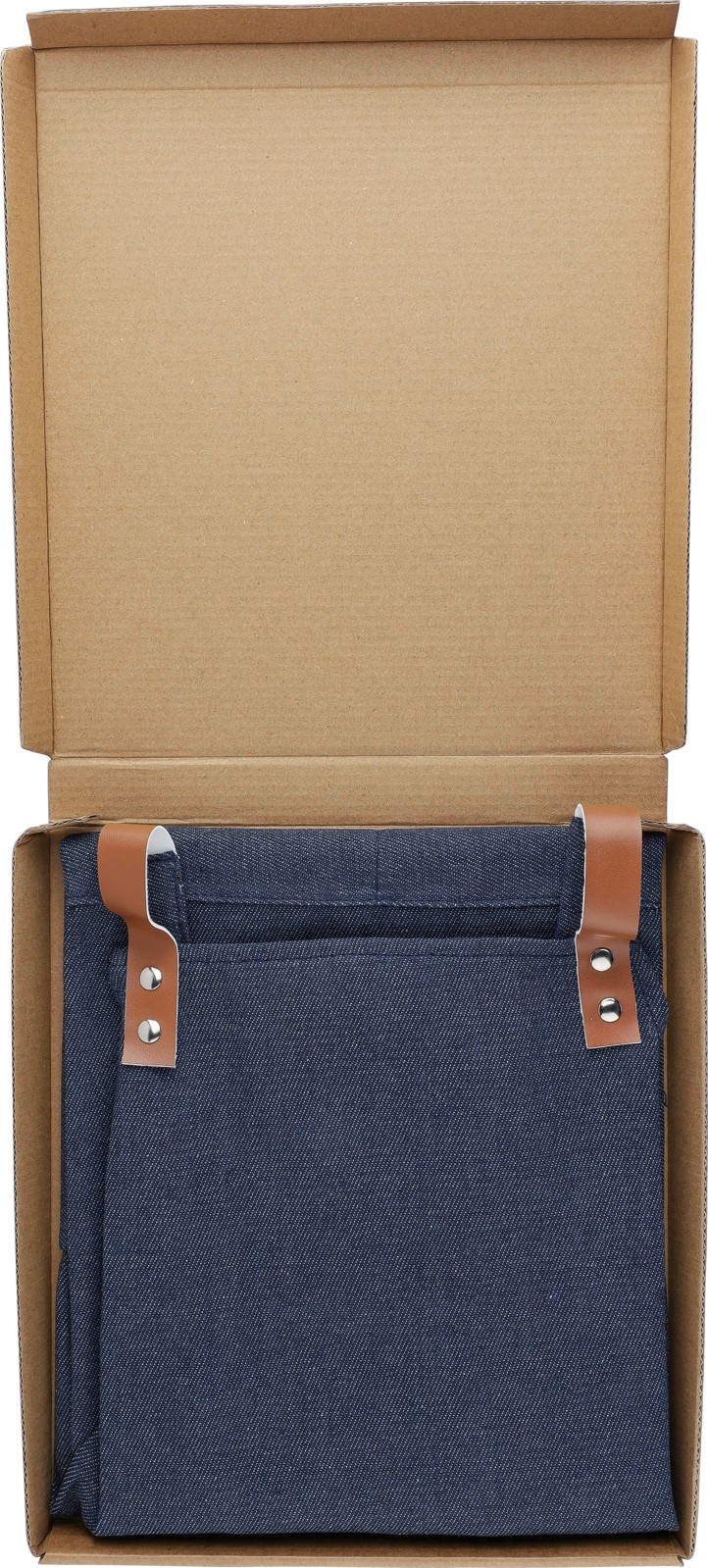 Denim-essu, denim 65 % polyesteristä ja 35 % puuvillasta. Toimitetaan yksittäin pakattuna ruskeaan kartonkiseen lahjarasiaan.