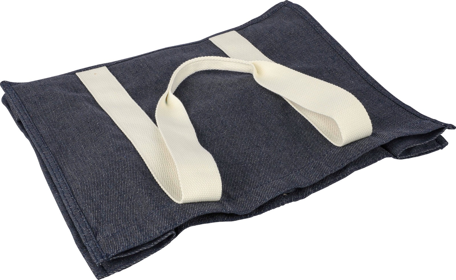 Tämän hetken trendikkäin logokassi! Denimi ostoskassi, jossa pitkät kangaskahvat. Kassi sulkeutuu yhdellä painonapilla. Sopii monenlaiseen käyttöön: messuille ja tapahtumiin, lahjaksi tai pieneen kiittämiseen.