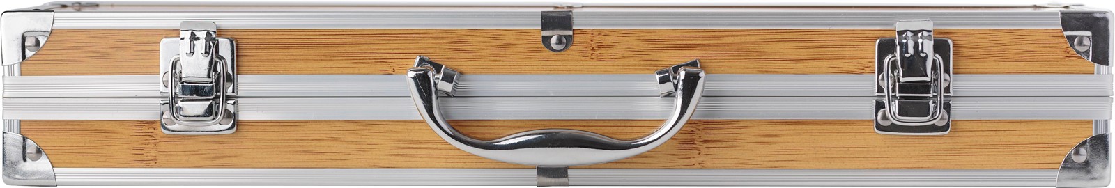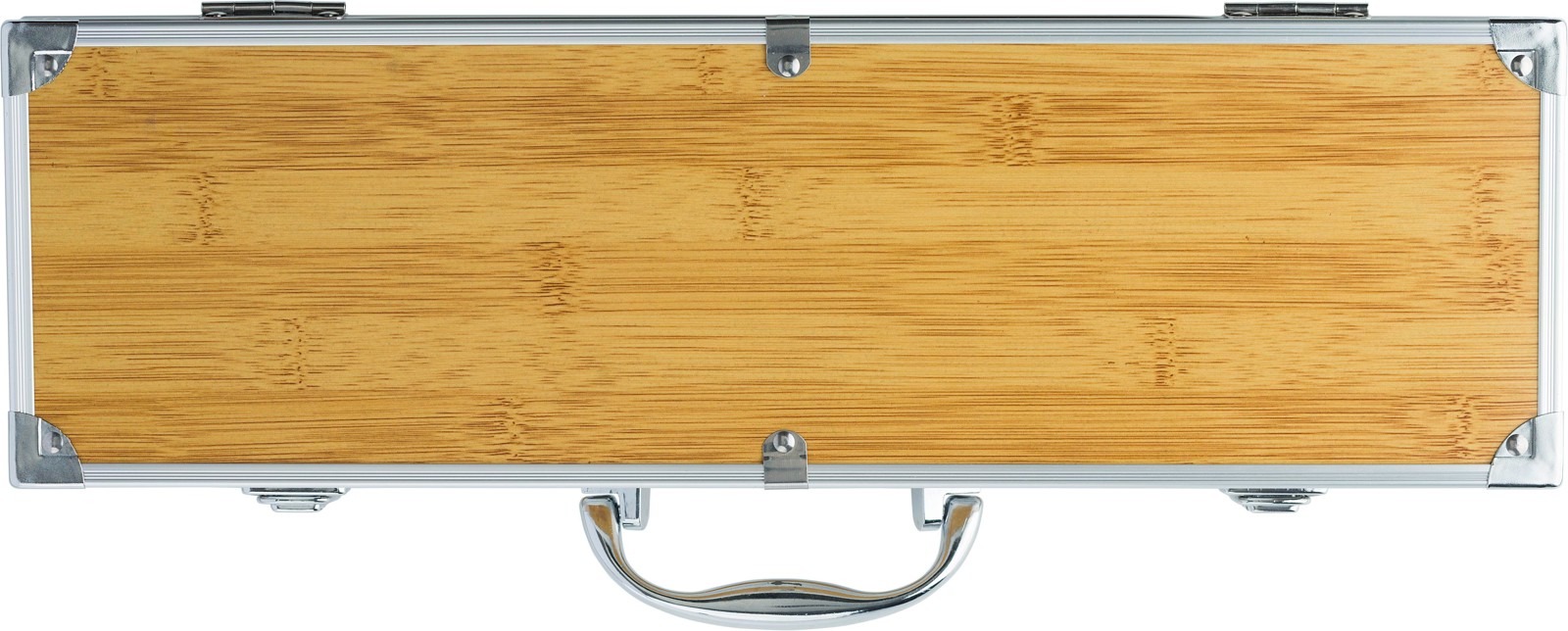 Grillaussetti Melina on täydellinen valinta kaikille grillaajille, jotka arvostavat korkealaatuisia ja kestäviä välineitä. Käytännöllinen alumiinikotelo ja elegantti bambukuvio tekevät tästä setistä myös tyylikkään lahjan.