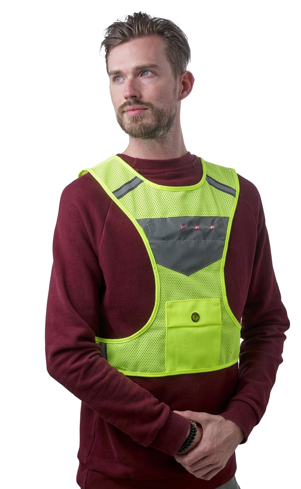 Huomioliivi nailonia ja polyesteria. Neon värisessä liivissä on heijastavia kohtia ja kolme valoa edessä ja takana. Mukana paristot. Mainoskäyttöön.