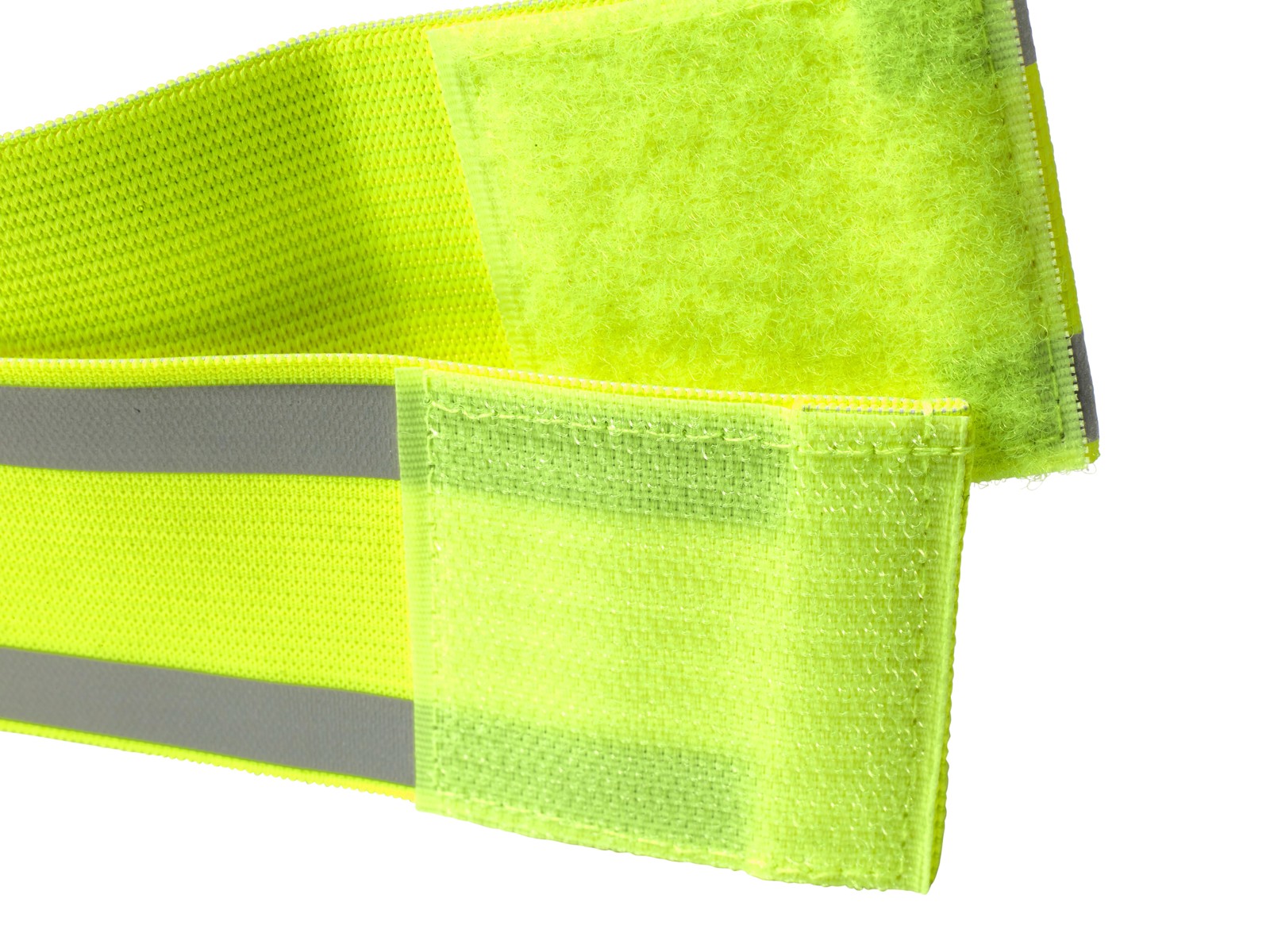 Elastinen käsivarsinauha, jossa kaksi heijastavaa raitaa (mainoskäyttöön). Tarranauhasuljenta.