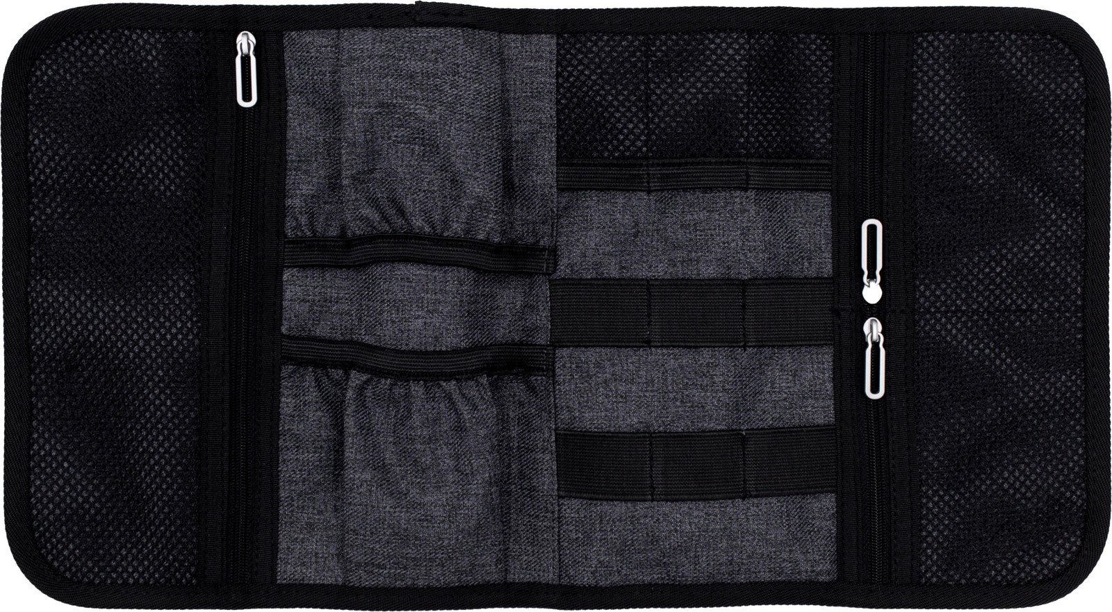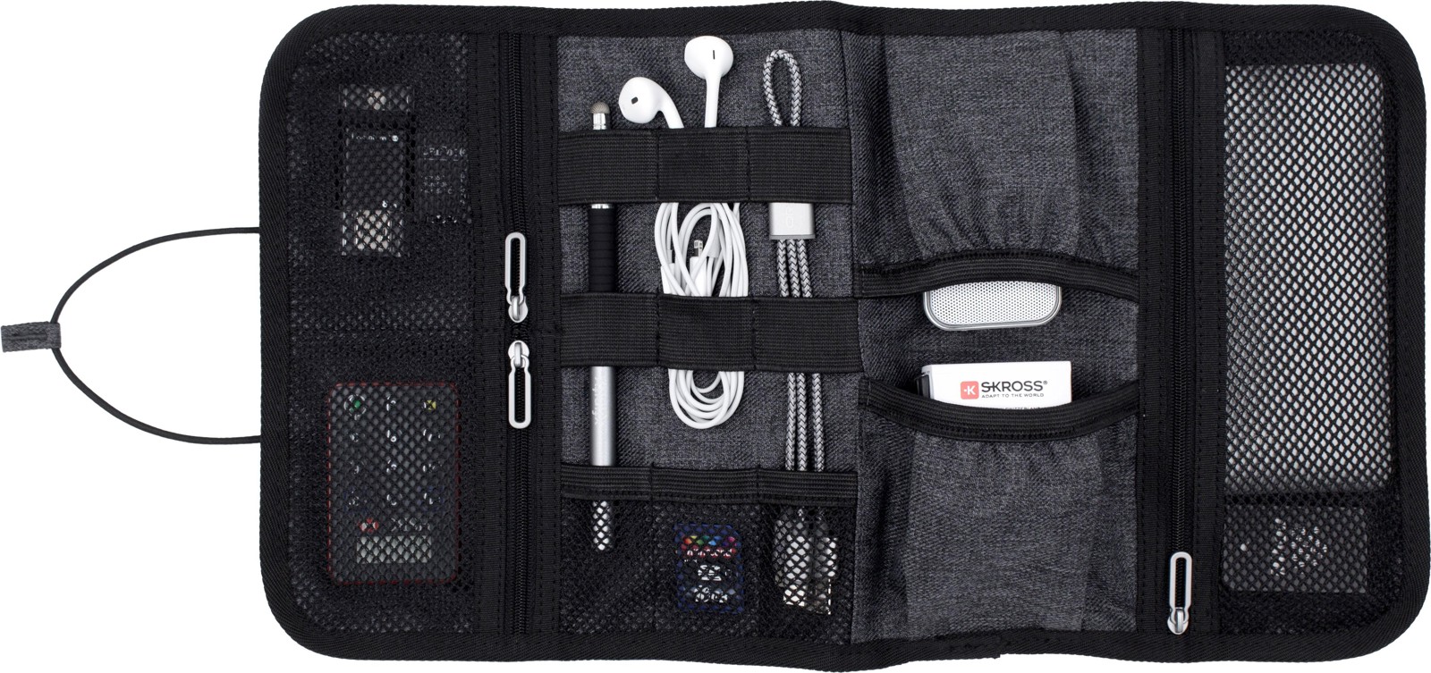 Folio-kotelo/järjestelijä pitää digitaaliset laitteet ja erilaiset pikkutavarat järjestyksessä. Valmistettu korkealaatuisesta vettä ja tahroja hylkivästä 600D-polyesteristä. Helppo säilyttää laukussa, repussa tai matkalaukussa. Kotelossa kolme verkkotaskua pienille esineille kuten USB-tikuille tai SD-korteille ja kaksi avointa taskua esimerkiksi latauskaapeleille.