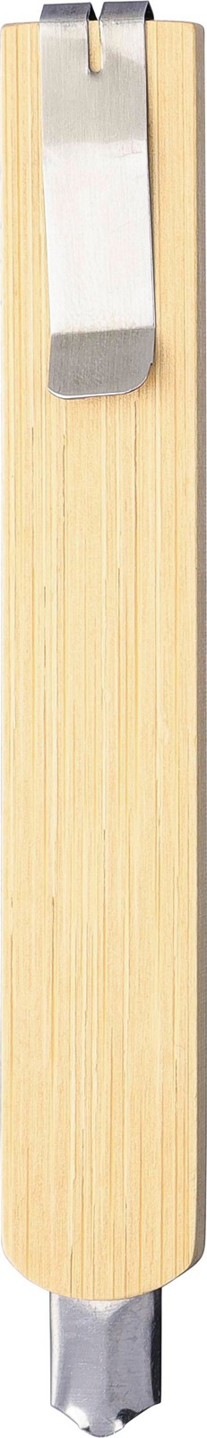 Mattoveitsi bambukahvalla. Takana metallinen klipsi. Terät valmistettu hiiliteräksestä. Yksittäin pakattu pussiin.