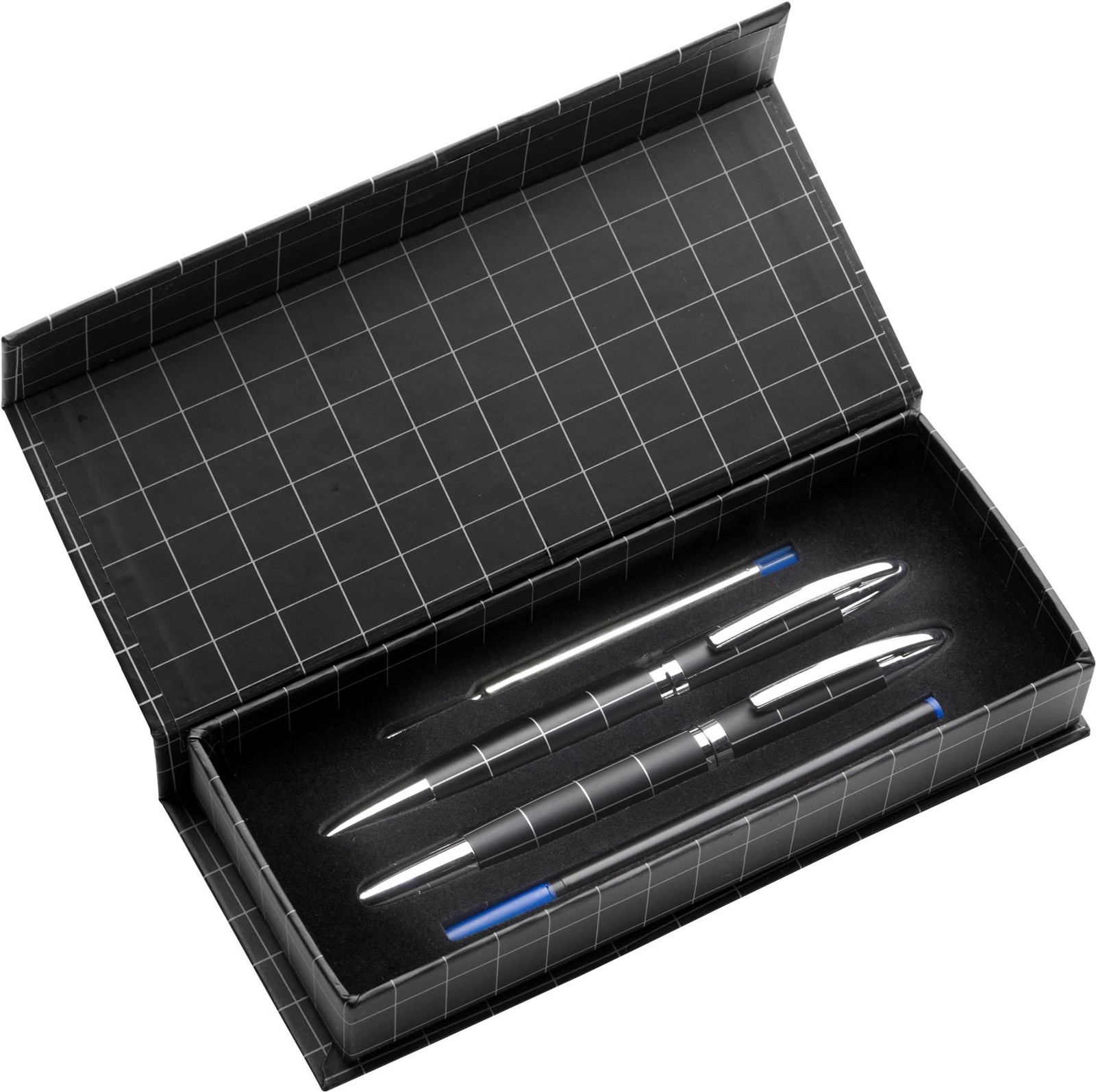 Metallinen kirjoitussetti Daniel on arvokas lisä jokaisen kirjoittajan työpöydälle. Tämä korkealaatuinen metallinen kirjoitussetti, joka sisältää sekä kuulakärkikynän että rullakärkikynän, takaa sujuvan ja mukavan kirjoituskokemuksen. Ylellinen kynälaukku magneettisuljennalla tekee setistä myös ihanteellisen lahjavaihtoehdon. Pahvista, kuparista, metallista ja EVA:sta valmistetut kynät tarjoavat kestävyyttä ja tyyliä, kun taas sininen muste ja lisämuste takaavat kirjoitusvälineiden pitkän käyttöiän. Valitse Metallinen kirjoitussetti Daniel ja nosta kirjoitusrutiinisi uudelle tasolle.