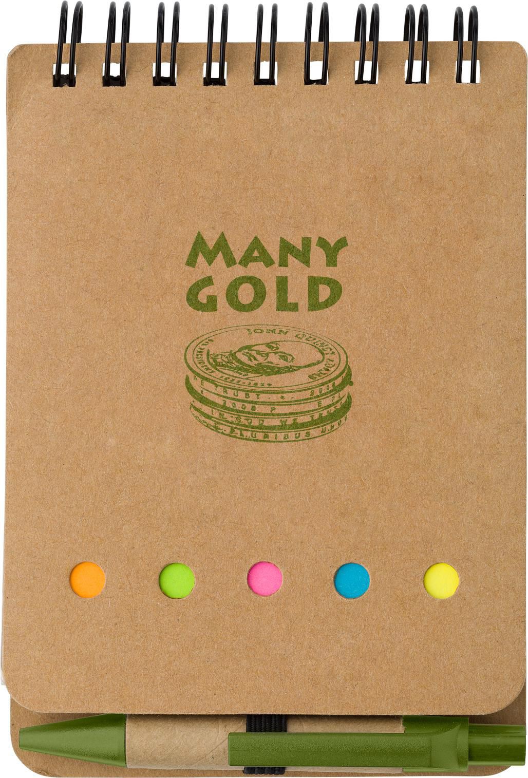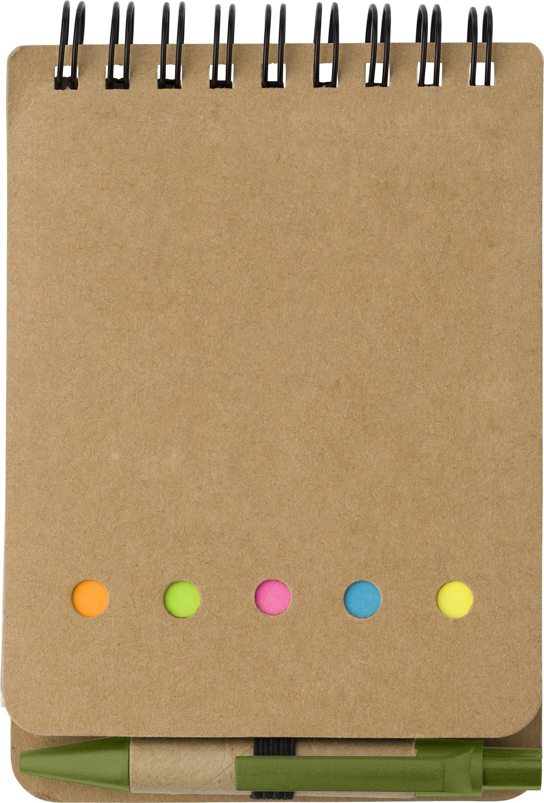 Kätevä muistilappusetti, jossa on 150 muistilappua, 60 viivoitettua sivua ja mustamusteinen kuulakärkikynä.