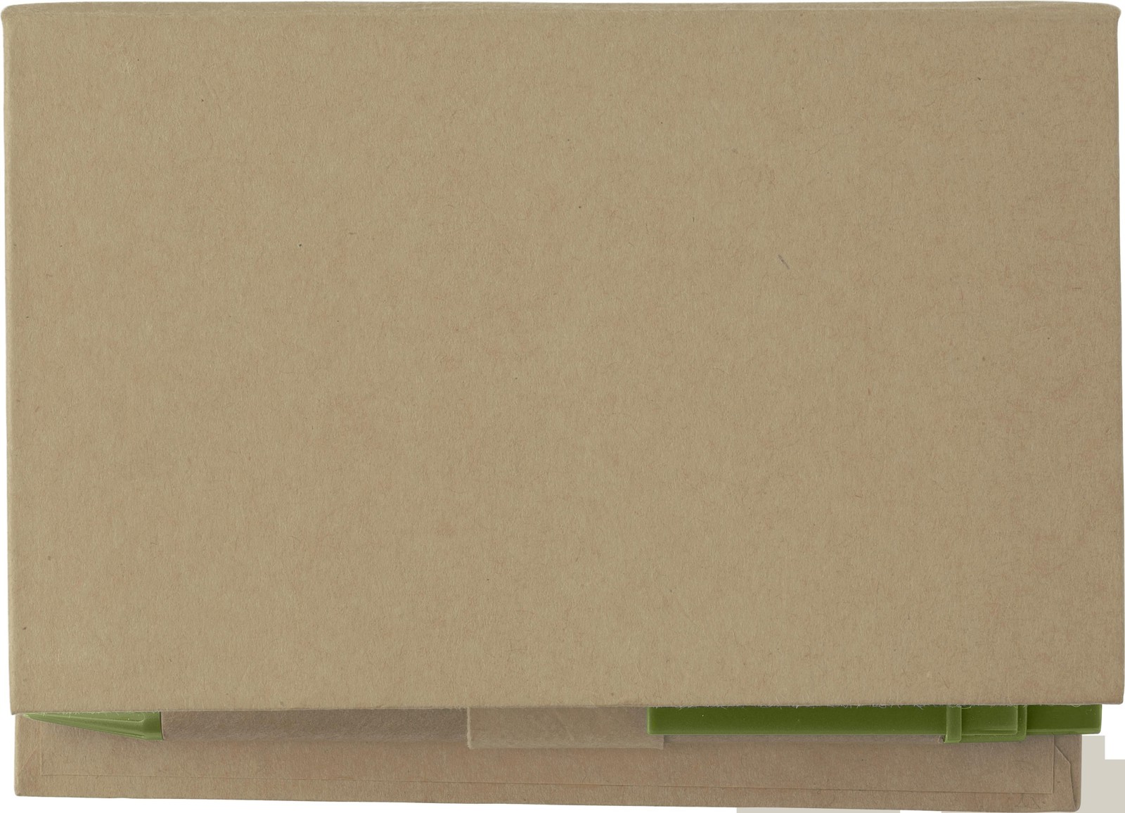 Pahvinen muistivihkosetti, joka sisältää tarralappuja ja muistilappuja. Tämä muistiinpanoteline sisältää kaiken, mitä tarvitset tehokkaaseen muistiinpanojen hallintaan, ja sen pahvinen rakenne tekee siitä kestävän ja ympäristöystävällisen valinnan. Mukana muovinen viivoitin, 150 muistilappua ja 160 tyhjää sivua.