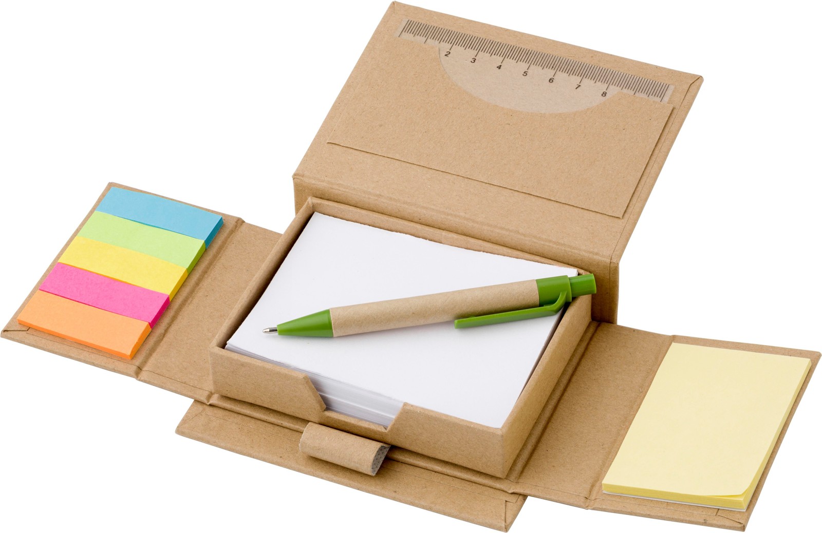 Pahvinen toimistotarvikesetti, josta löytyy muovinen viivoitin, 150 muistilappua ja 160 tyhjää sivua. Mukana on sinimusteinen kuulakärkikynä.