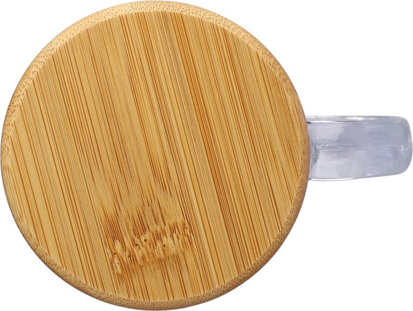 Kierrätetystä lasista valmistettu muki (300 ml), jossa bambukansi. Pakattu yksittäin ruskeaan pahvilaatikkoon.