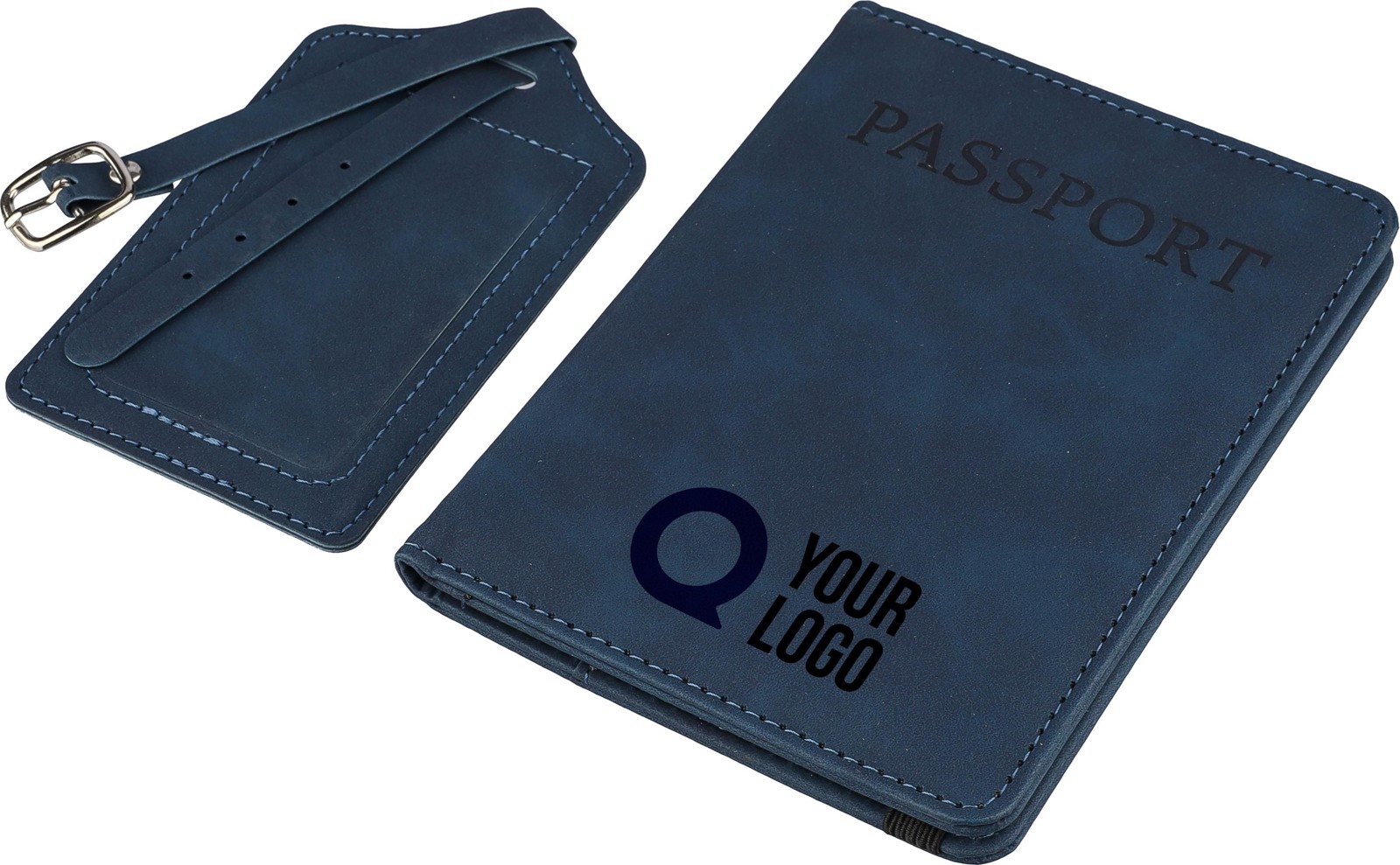 Kierrätetystä PU-materiaaleista valmistetut passikotelo ja matkalaukkuetiketti. Pakattu yhdessä ruskeaan kuviolliseen pahvipakkaukseen. Passikotelon etupuolella teksti “passport” ja sisällä kaksi lokeroa passin turvallista säilytystä varten. Molemmat tuotteet on viimeistelty kohopainetulla kierrätetyn materiaalin merkillä.