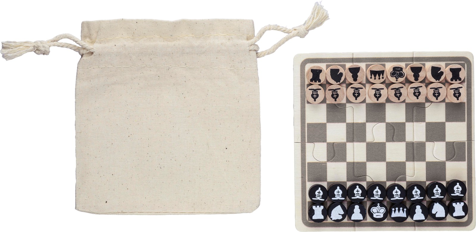 Puinen shakki- ja tammi-peli puuvillaisessa narupussissa. Sisältää peliohjeet. Koko: 11.2 x 11.2 x 0.2 cm.