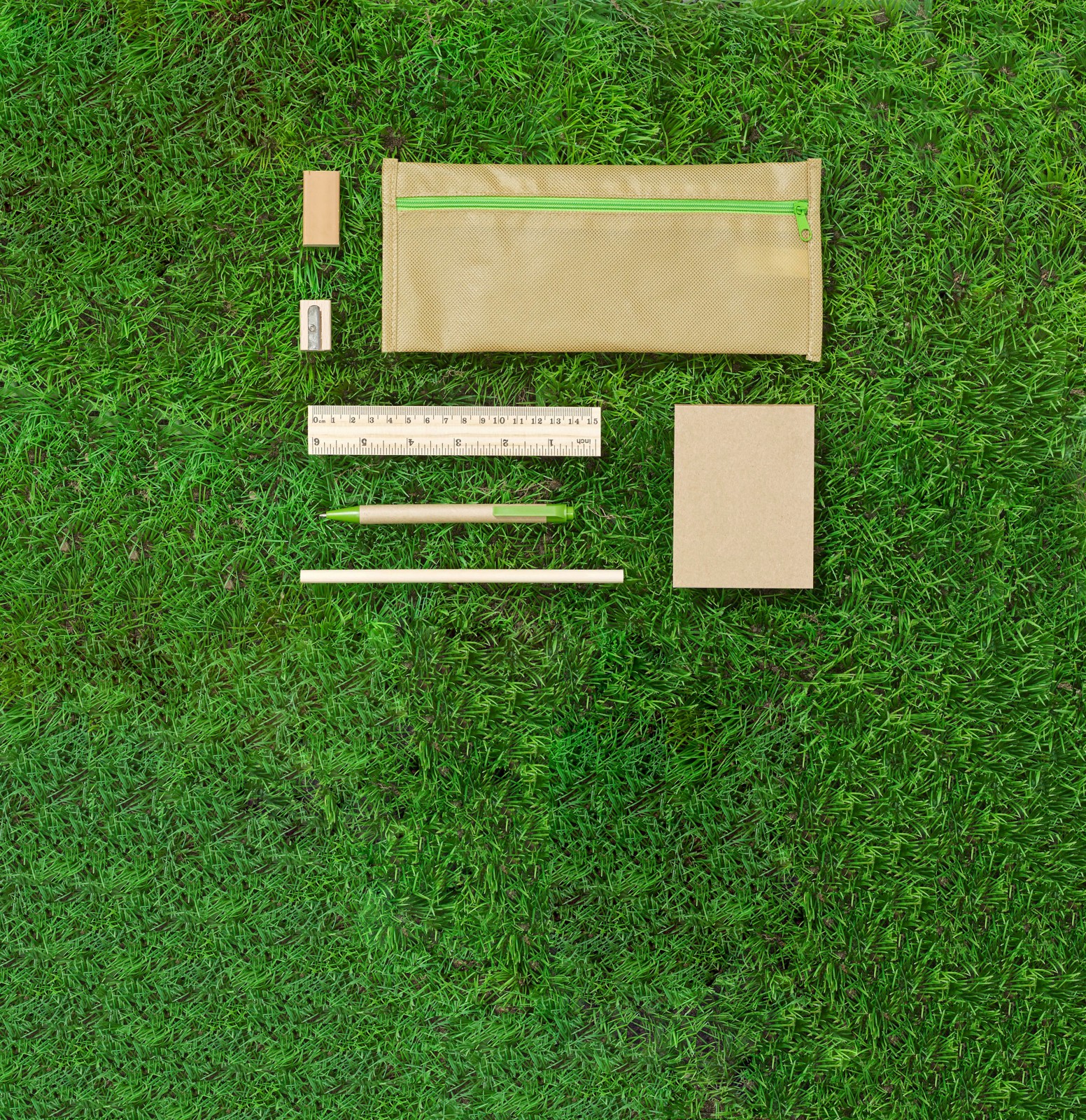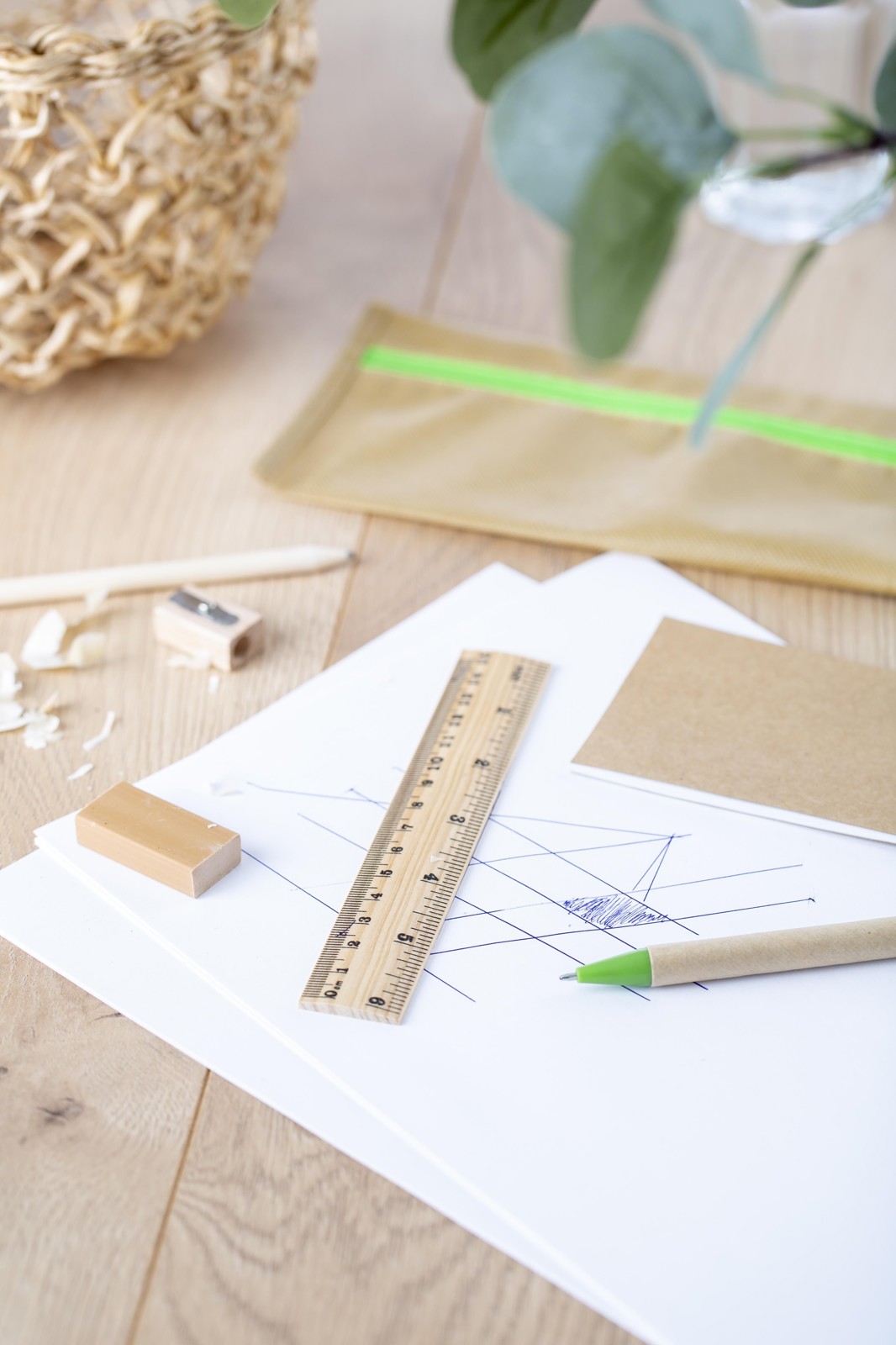 • Sisältö: Puinen viivotin, pahvinen kuulakärkikynä, lyijykynä, teroitin, pyyhekumi ja muistilappu