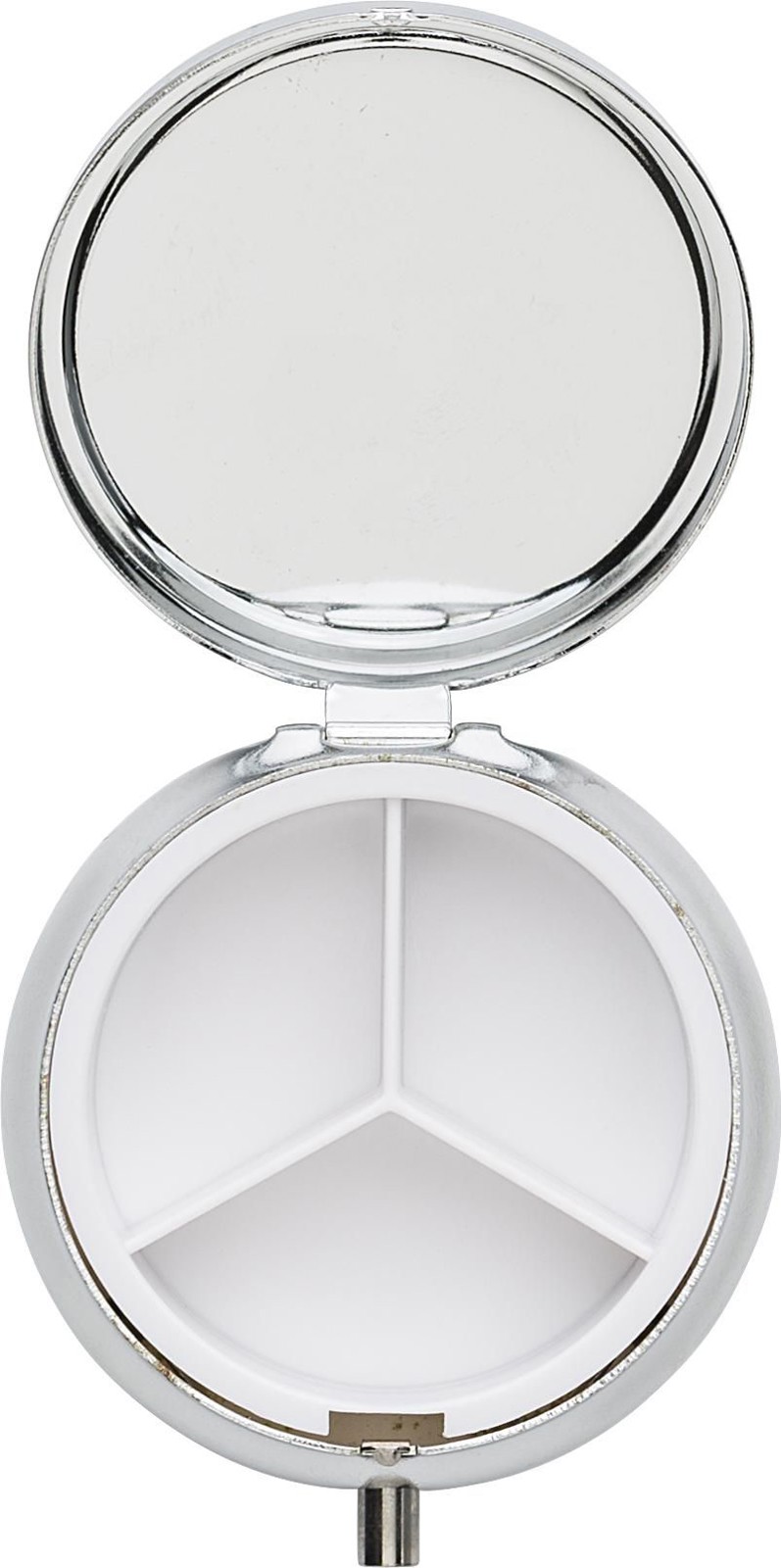 Pyöreä pillerirasia, jossa on 3 osiota. Muovia.