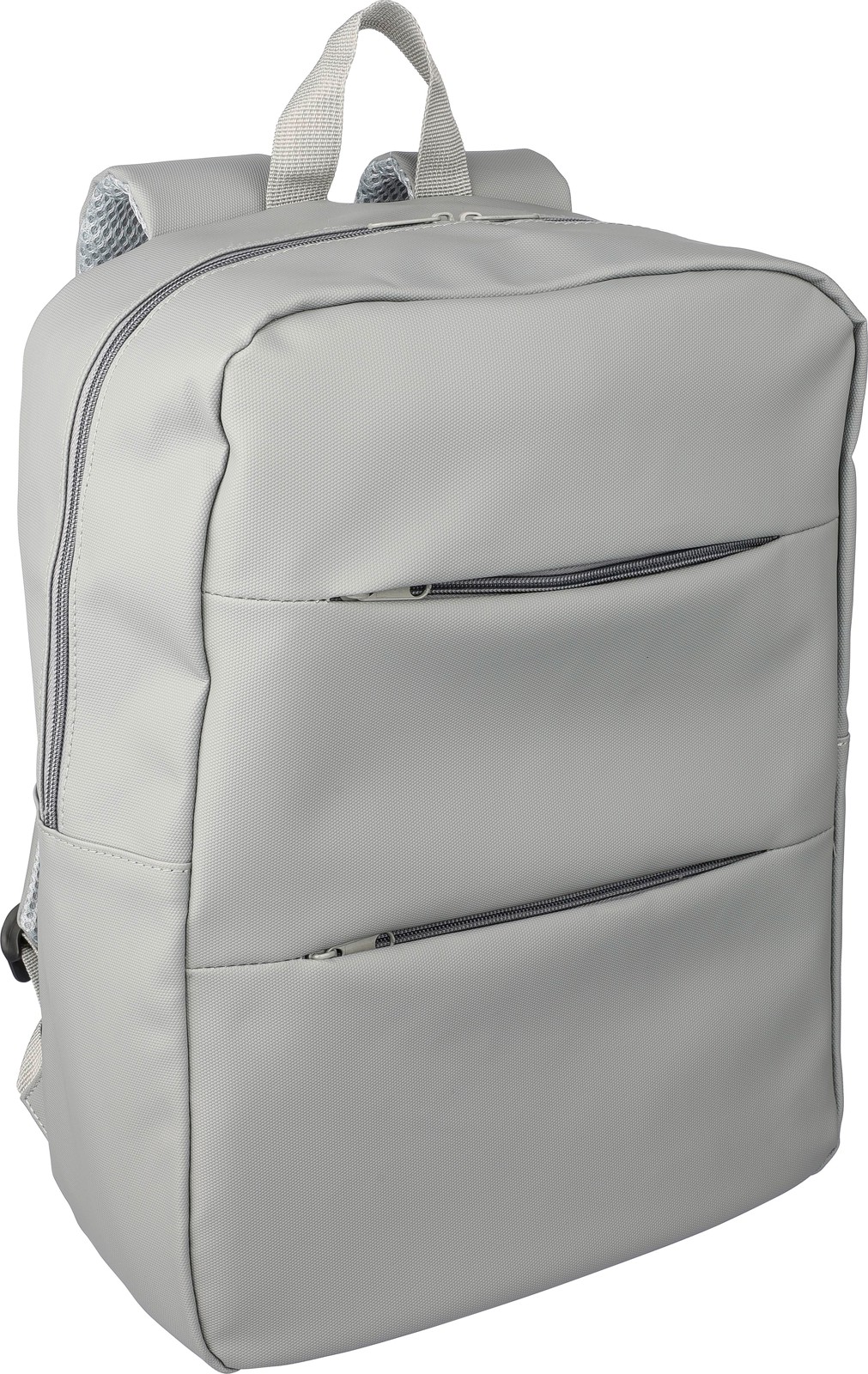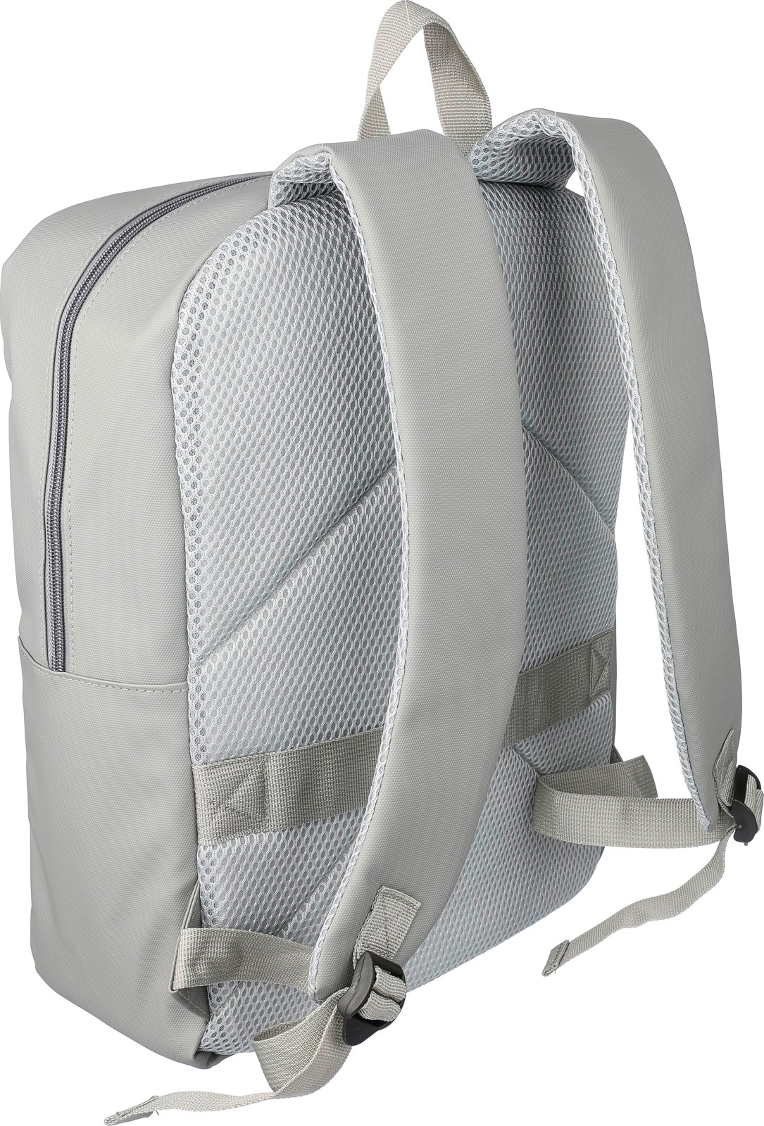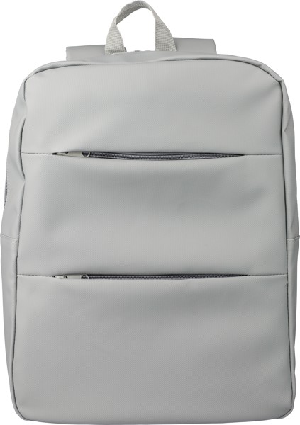 PU-materiaalista valmistettu läppärireppu, jossa kaksi vetoketjullista etutaskua, suuri vetoketjullinen päälokero tarranauhalla suljettavalla 15" läppäritaskulla ja useita sisätaskuja.
