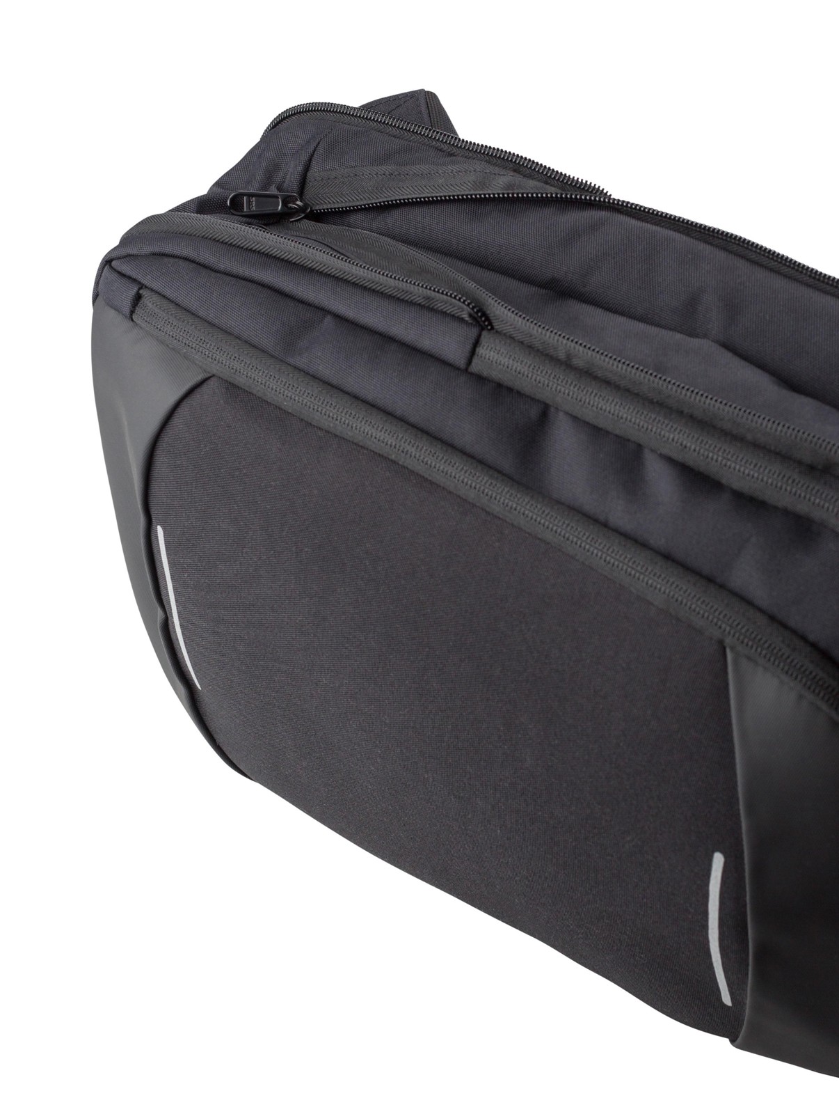 Reppu, jossa vetoketjullinen etutasku ja säädettävät, pehmustetut olkaimet. Takapuolella salatasku ja edessä heijastavat raidat. Polyesteria (600D).