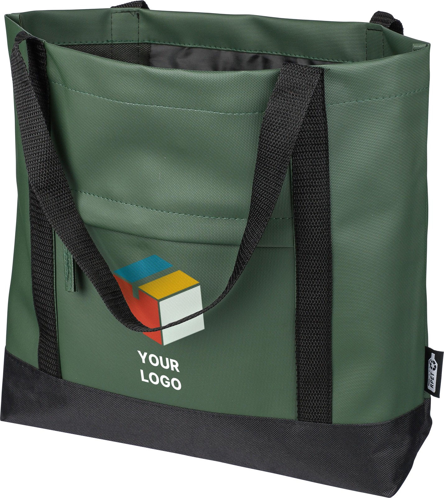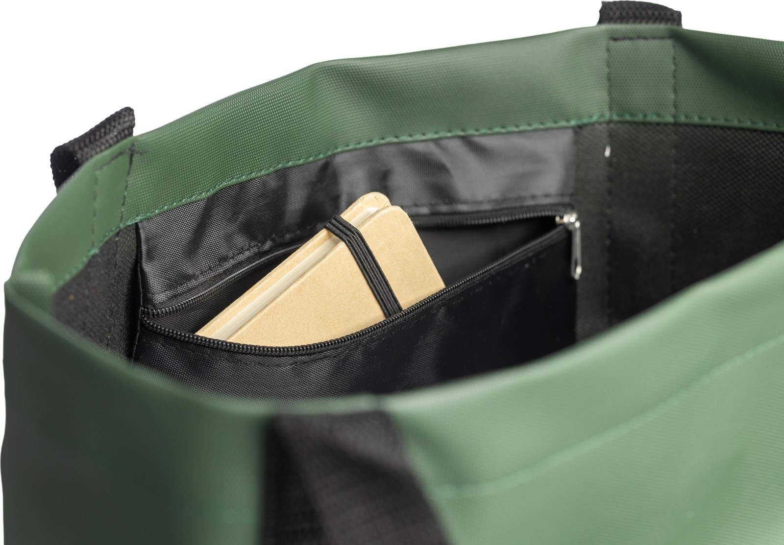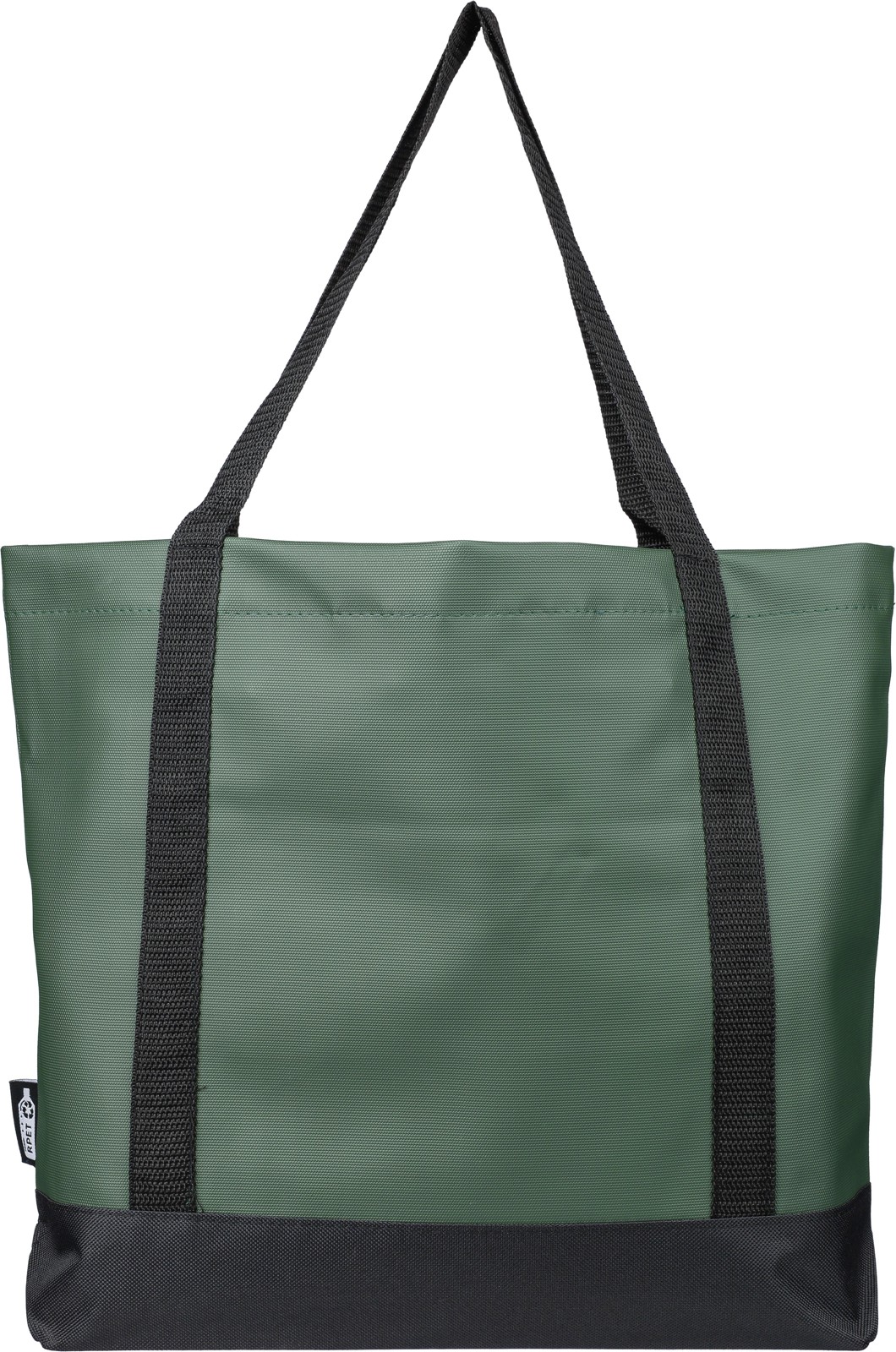 Vetoketjullinen sivutasku sekä pieni sisätasku. Mukava kantaa ja tilava. Kassin sivussa rPET-logomerkki.