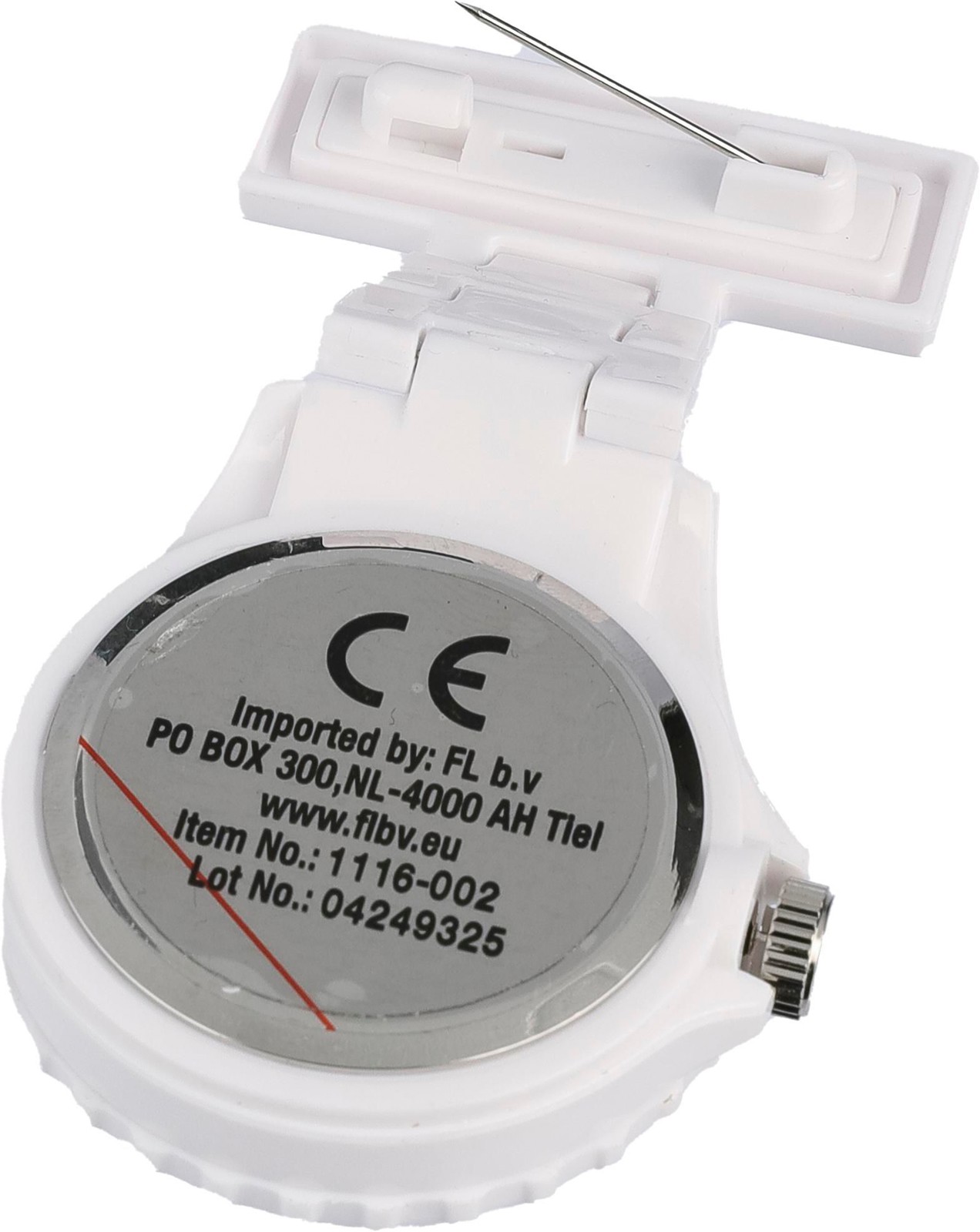 Muovinen hoitajankello, jossa on suorakaiteenmuotoinen levy painatukselle sekä hakaneula. Mukana paristot. Suunniteltu erityisesti helpottamaan hoitohenkilökunnan arkea.