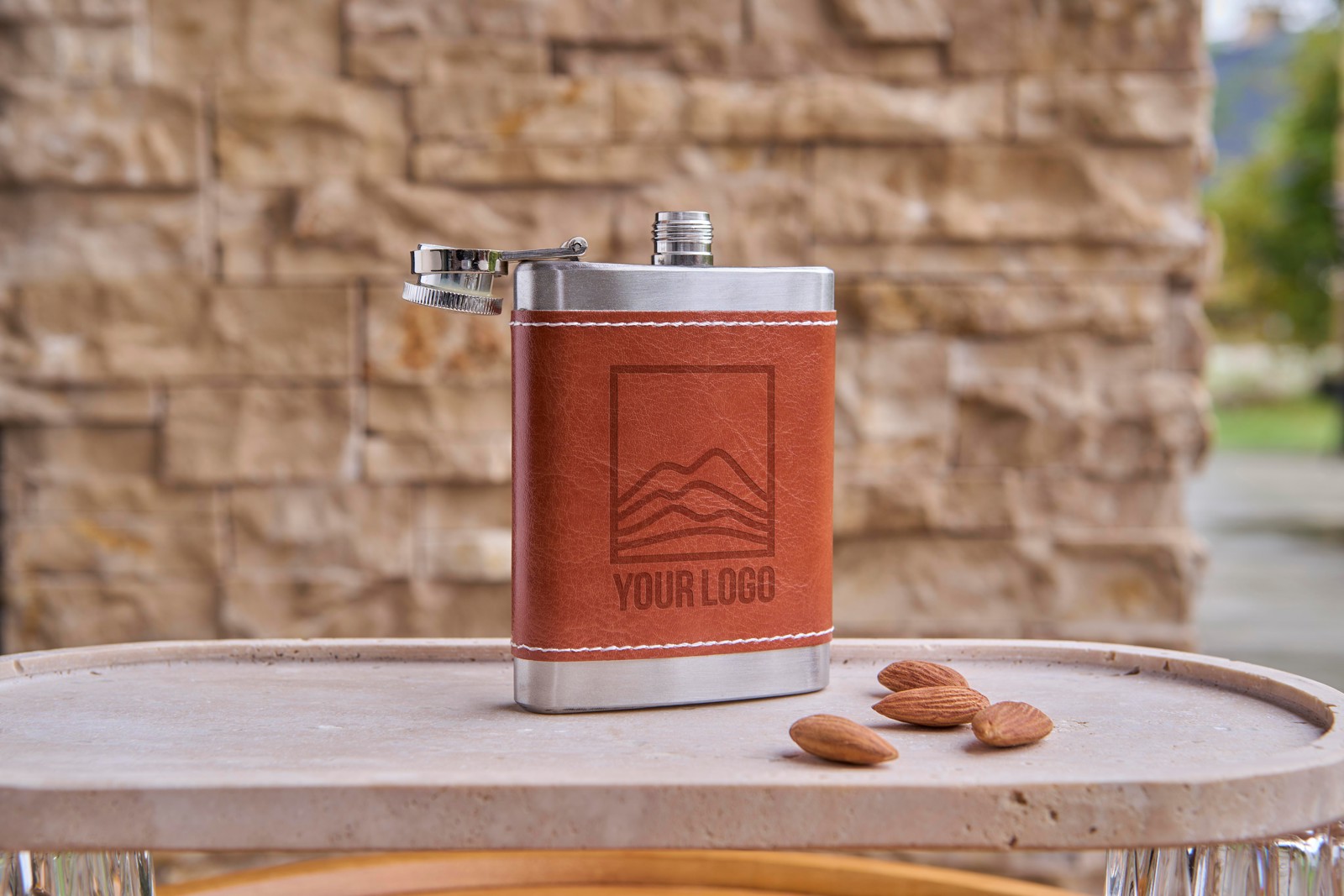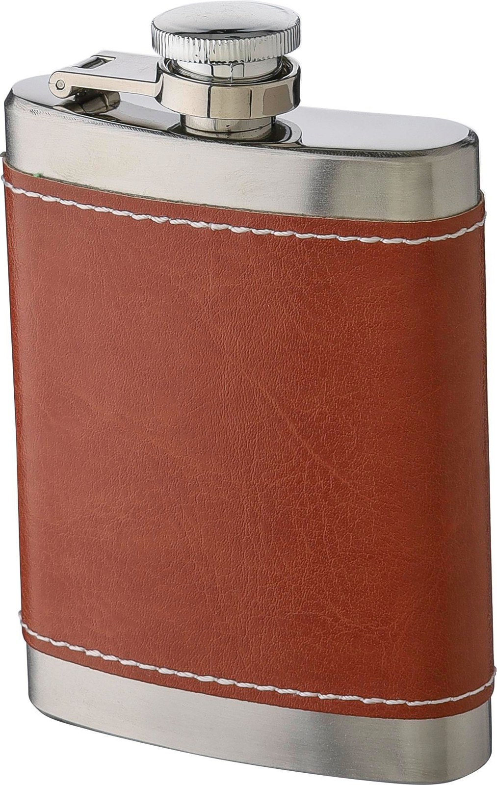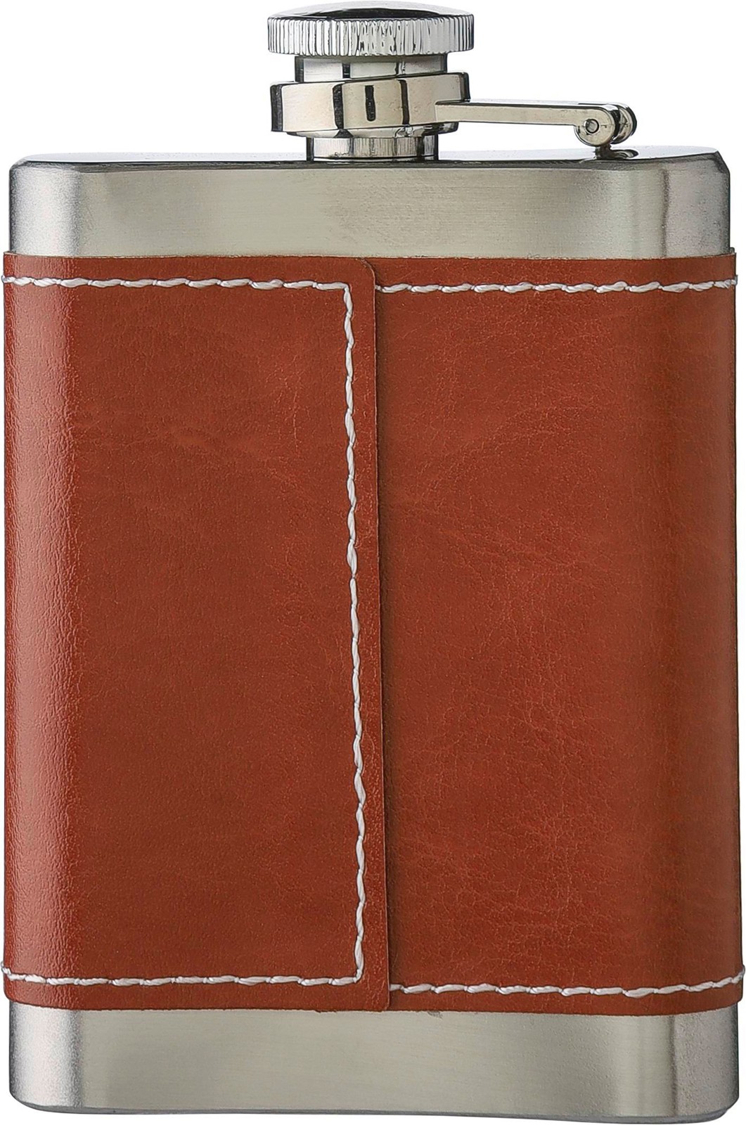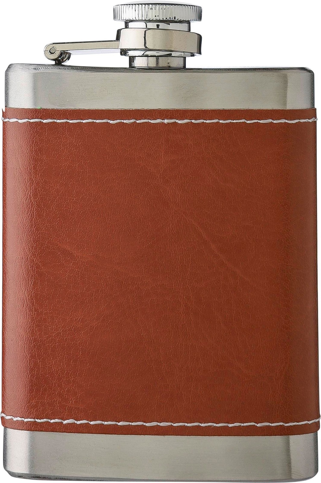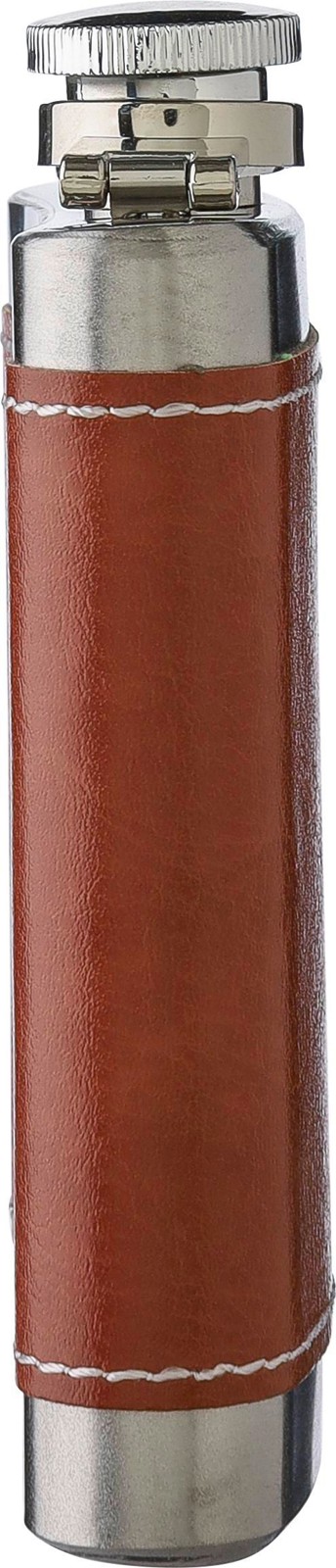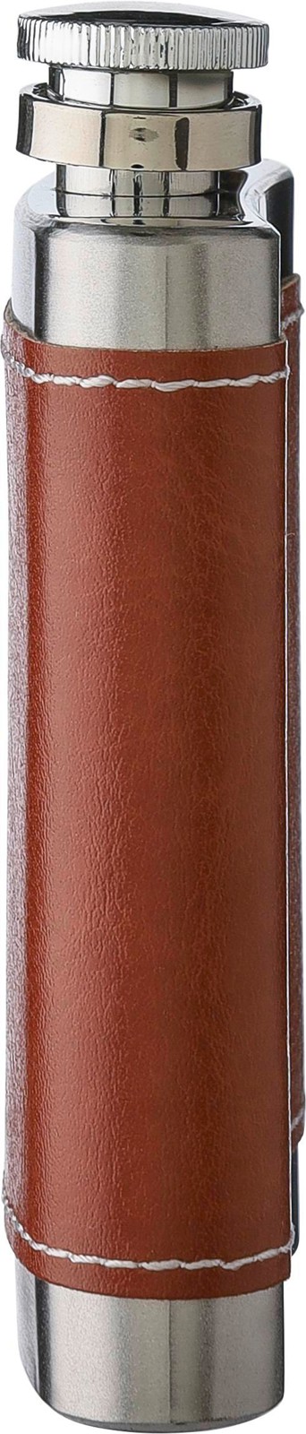 Ruostumattomasta teräksestä valmistettu taskupullo (100 ml). Yksittäin pakattu ruskeaan pahvilaatikkoon.