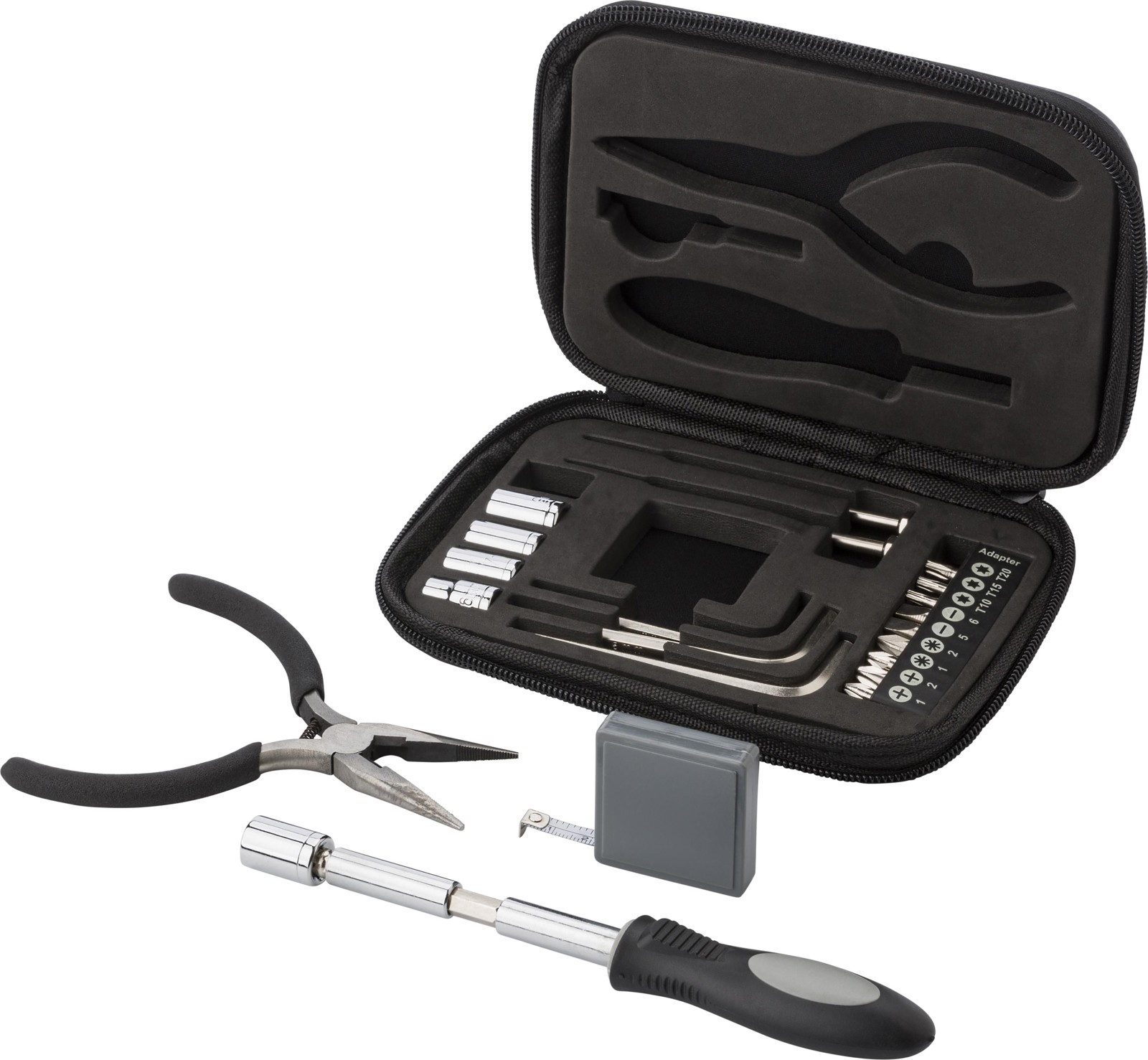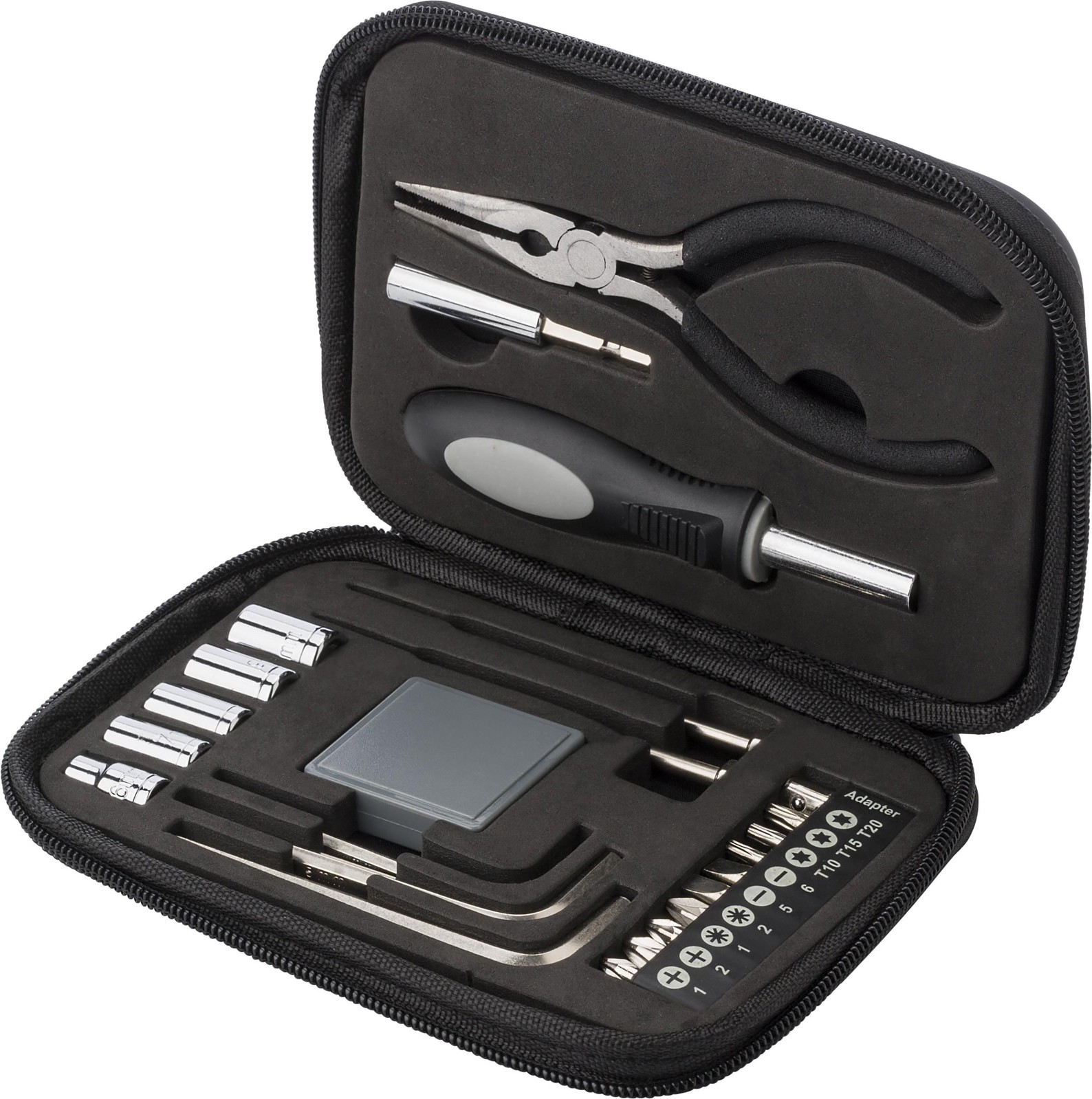 • Sisältö: kaksi pihtiä, pidike, jossa on yhdeksän erilaista bittiä, sovitin, pinsetit, neljä vetopistorasiaa, sovitin, kahva ja kuusi erilaista tarkkuustyökalua