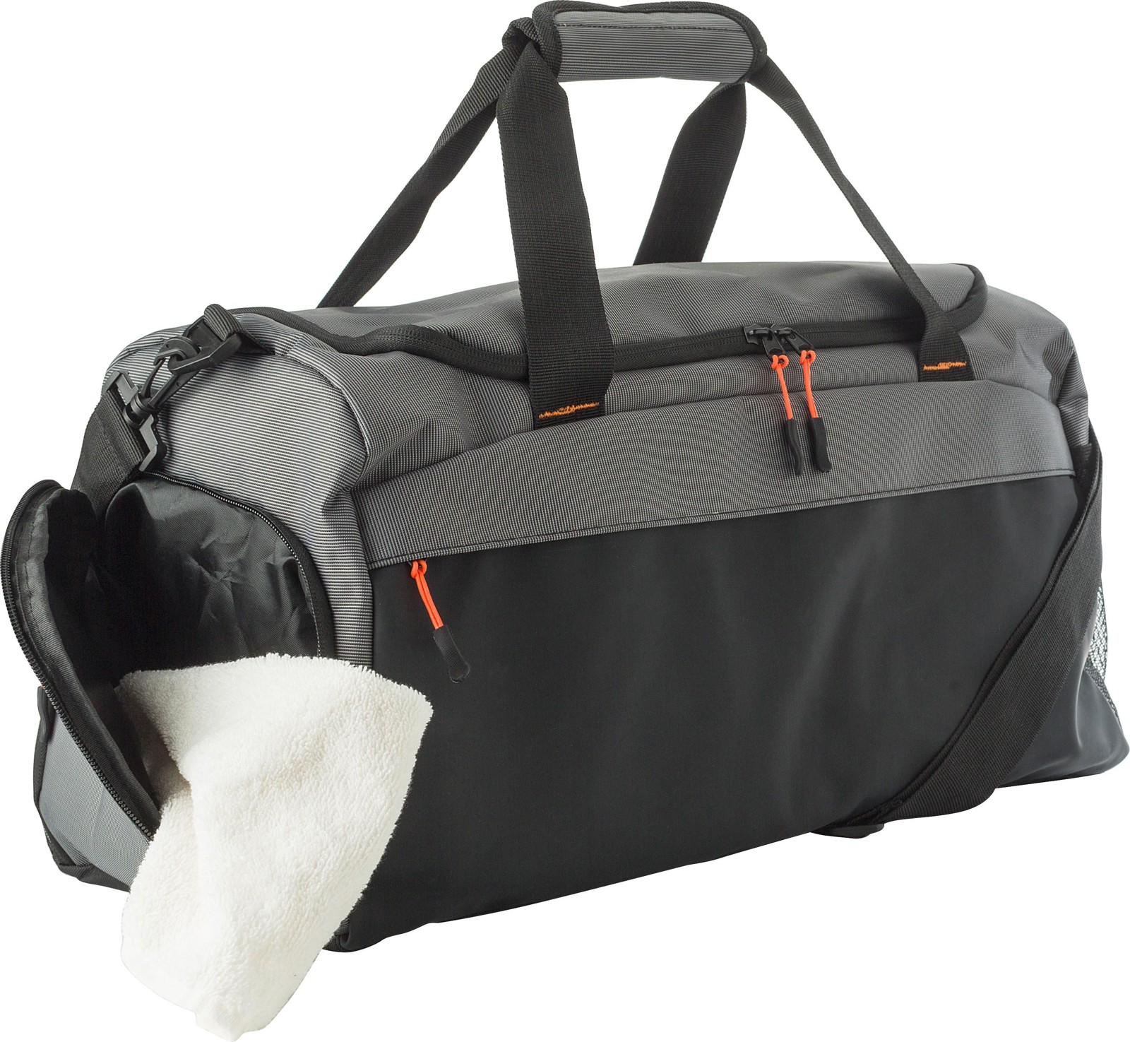 Tämä kaksisävyinen duffelilaukku on valmistettu laadukkaista materiaaleista (polyesteri 600D ja nylon 210D). Se tarjoaa erinomaisen tilan ja turvallisuuden vetoketjullisen etutaskun ja suuren päälokeron avulla, jossa on vahvistettu pohja. Erillinen sivukenkäosasto ja verkkotasku lisäävät laukun käytettävyyttä ja monipuolisuutta. Lyhyet kahvat, joissa on tarranauhasulkeminen, tekevät laukun kantamisesta mukavaa ja helppoa. Sopii myös yrityslahjaksi.