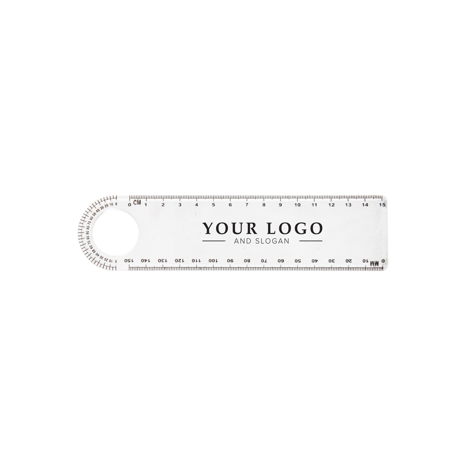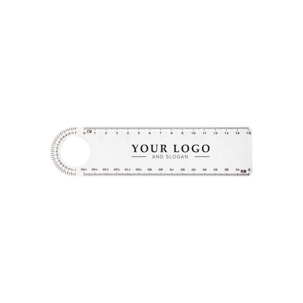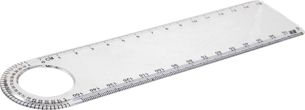 15 cm muovinen viivoitin, jossa suurennuslasi sekä astelevy.